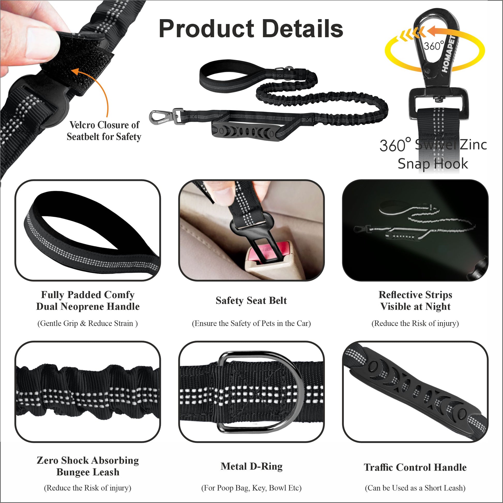 Black Polyester Full Bungee Dog Leash